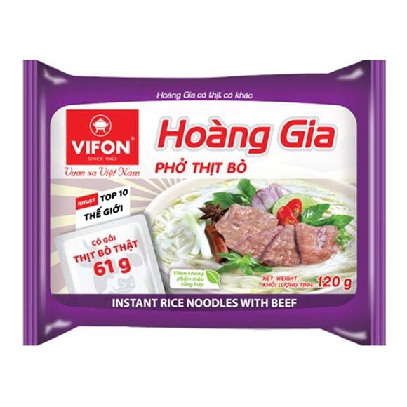 Những sợi phở trắng, thơm ngon và dai cùng với nước sốt đậm đà, thơm ngon với hương vị bò thơm thơm. Phở thịt bò Vifon Hoàng Gia gói 120g (gói thịt bò thật 61g) với sự tiện lợi, nhanh chóng cho bạn bữa ăn không mất nhiều thời gian mà vẫn đảm bảo dinh dưỡng của phở Vifon